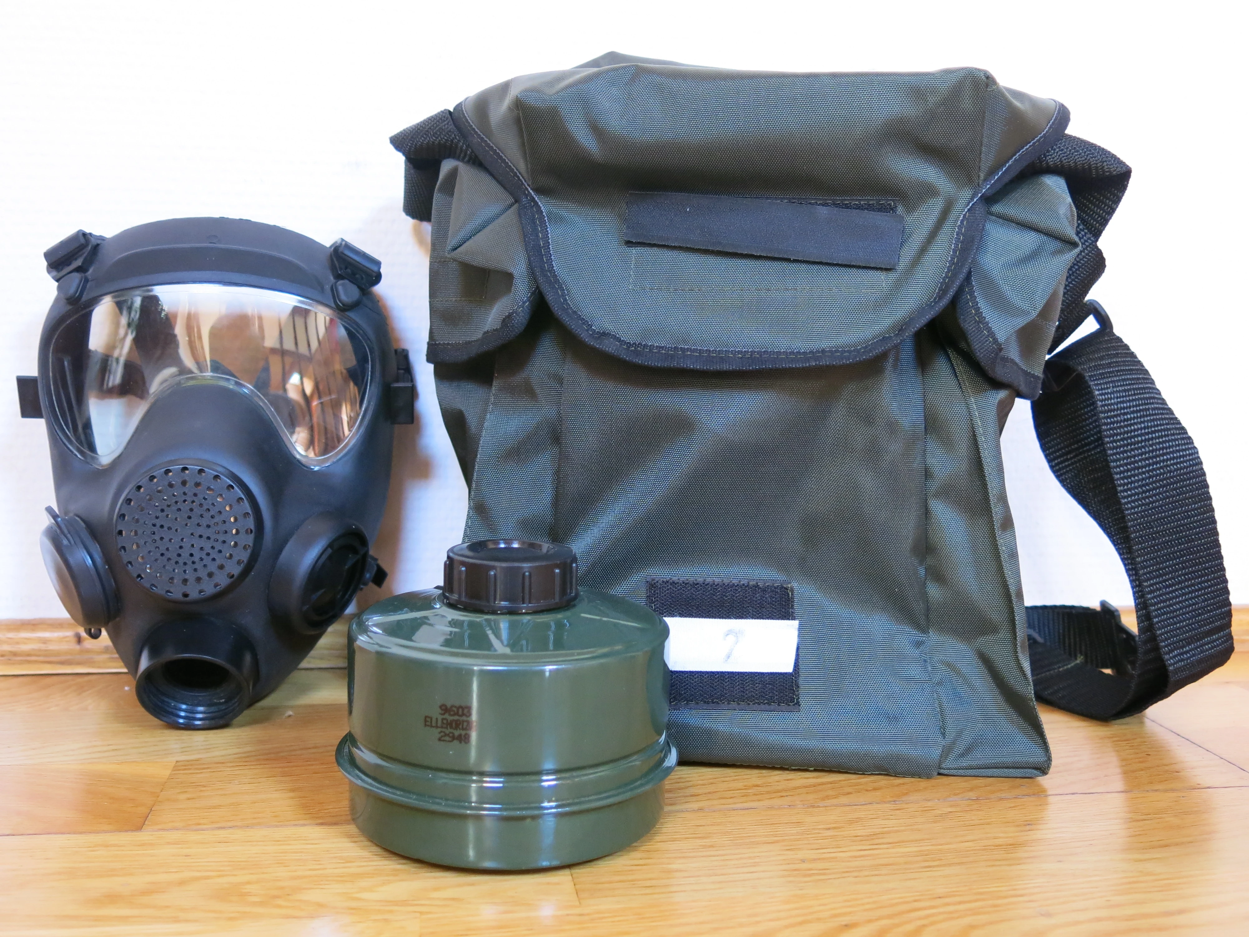The bag is made of plastic impregnated fabric, it can hold all the accessories of the mask. The user can wear it on the shoulder or on the belt.
