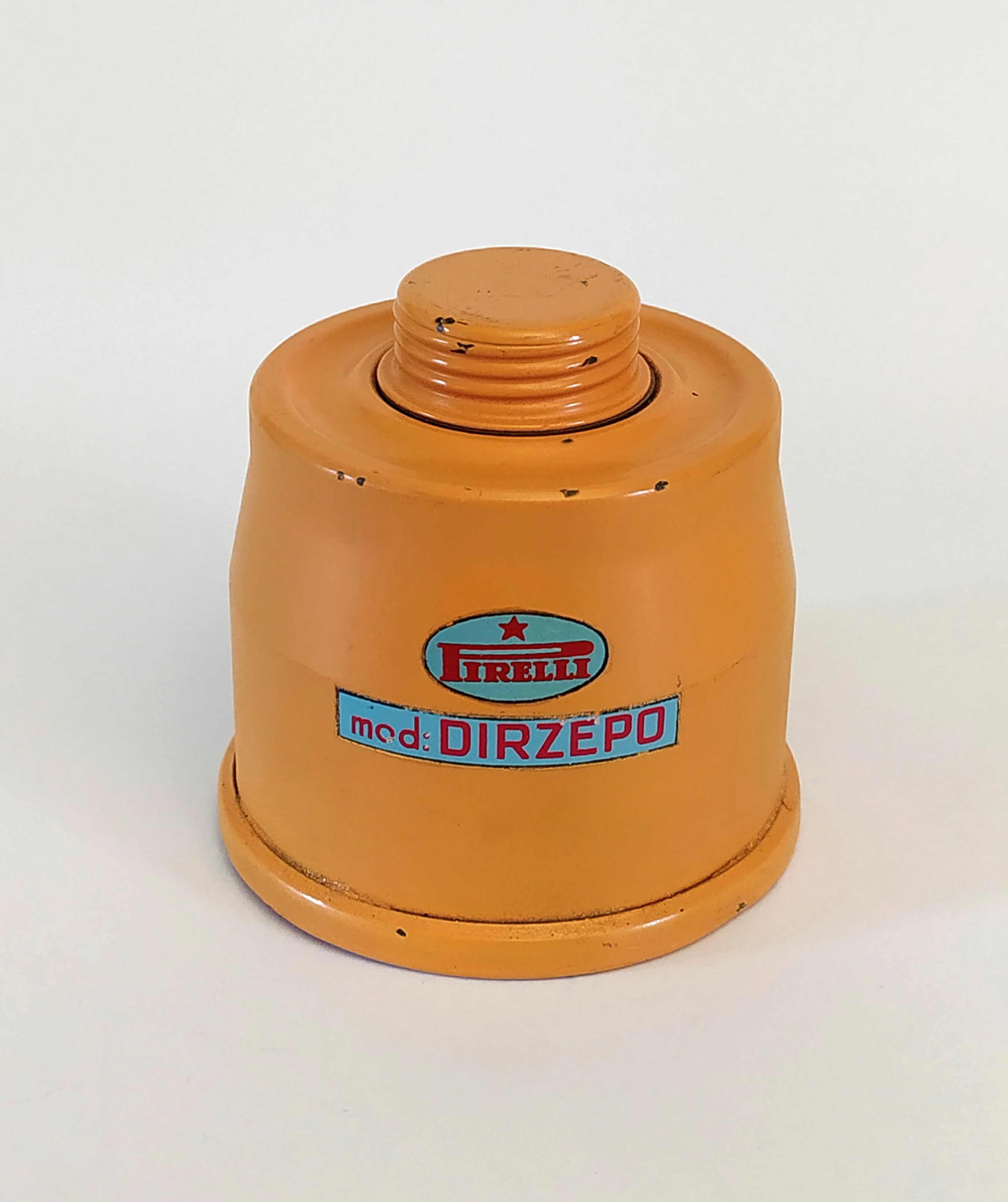 The Dirzepo was the civilian variant of the T.35 filter, varying only in the colour being light orange, the upper collar being some times slightly different and the markings, which showed the name and in some cases the S.C.M. license too. The filter contains a layer of particulate filtering material made of resin-impregnated wool and viscose rayon at the bottom and a layer of activated charcoal, pumice and other blocking substances at the top. Before being opened, the bottom intake is covered by a small sheet of waxed canvas and the top is closed using a 40 mm lid, with all of this bound with a string closed using a small lead seal. After the filter has been opened for the first time, it could be closed again using the 40 mm lid and a small rubber seal attached through a string to the filter.