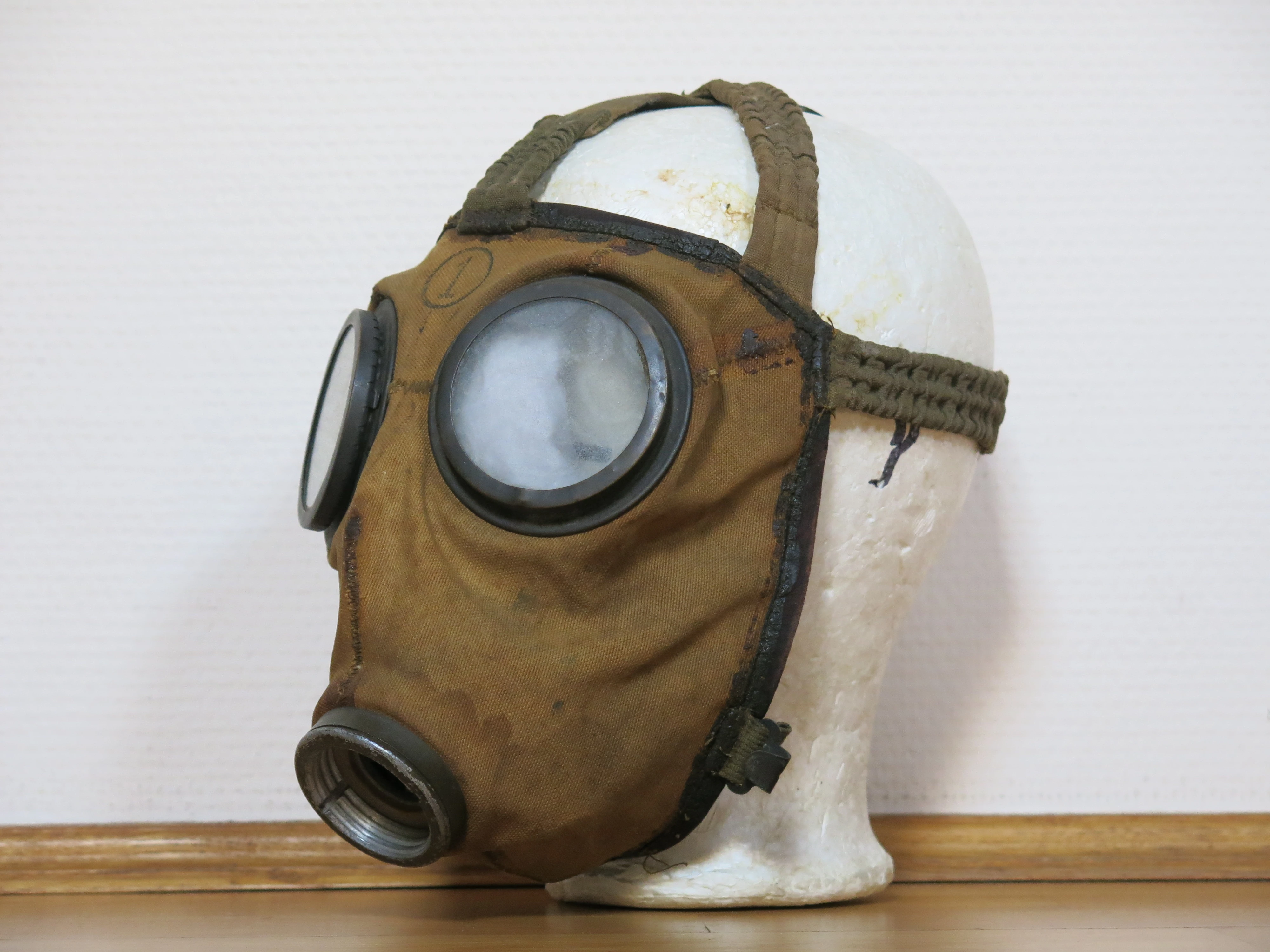The facepiece is of is composed of 4 rubber-coated light brown canvas sheets and formed by 7 seams, one on the chin and between the eyepieces and two between each eyepieces and the forehead part. It seals on the face via 4cm wide goat leather stitched to a rubber-coated canvas verge.