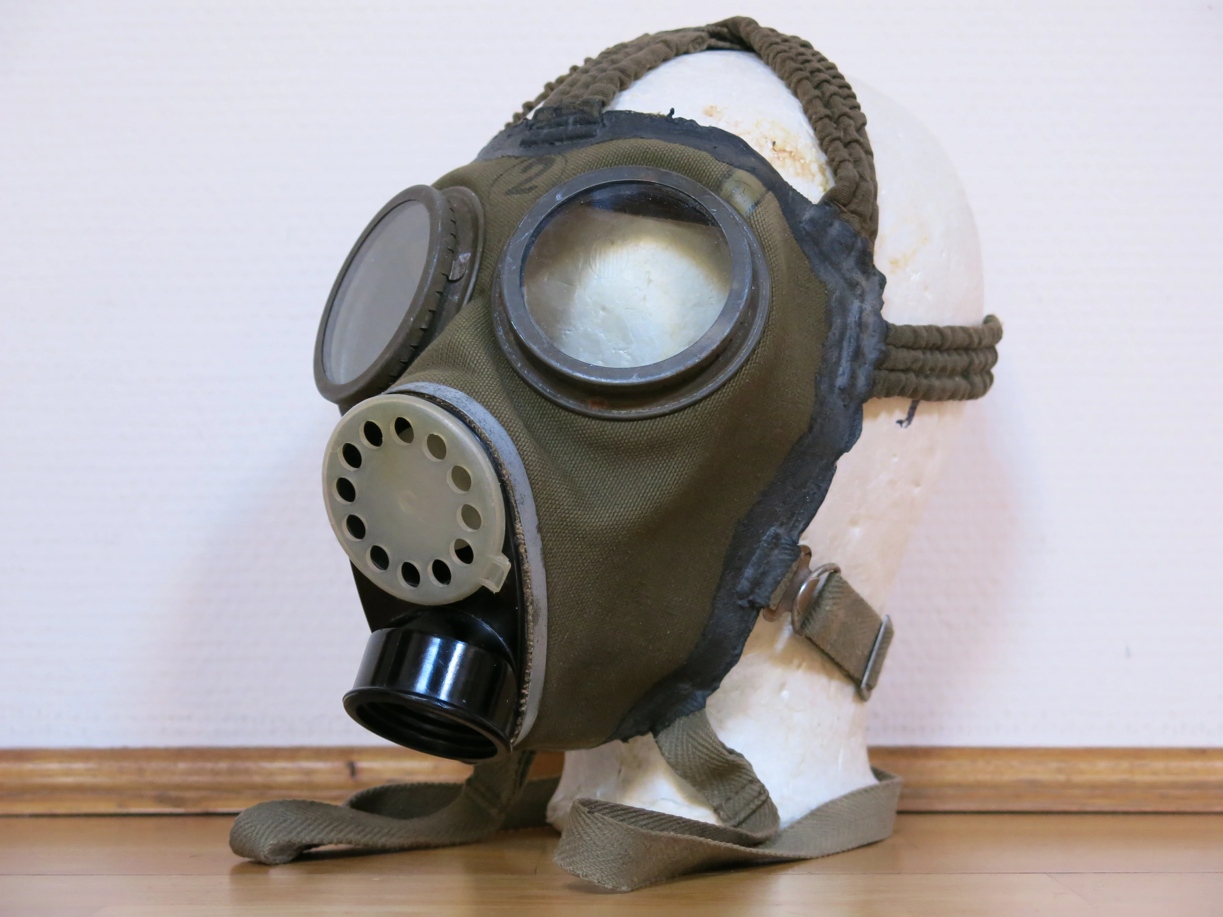 It is a full face mask made of a single sheet of rubber-coated green canvas formed by 3 seams, 2 on the forehead and one on the chin. It seals on the face via 4cm wide goat leather stitched to a rubber-coated canvas verge but unlike on the 34M it isn't folded out, it is sealed by rubber cement on the edge. The eyepieces can be either shatterproof (it is composed of two glass layers and a thin sheet of cellulose between) glasses or plexi. The 7 pointed, adjustable and elasticated harness is composed of three pieces and sewn to the facepiece. The middle forehead straps is hooked over a metal roller frame and sewn to the outer forehead straps, so these can slide freely and automatically adjusts to the shape of the head. On the nape the temple straps and the strap of the roller frame are hooked up to a metal piece which is riveted to a leather pressure equalizer rectangle. The third part near the bottom would be wrapped behind the neck of the user and hooked to the left side of the mask to provide a tight seal and to prevent accidentally taking off the mask. Elastication of the straps is provided by either springs like on the 67M or by rubber bands like on the 75M. There is a carrying strap on the bottom back of the mask and a chinstrap inside as well. The valves are in one black, oval bakelite piece. The "tulip" styled exhale valve is on top of the downwards facing 40mm DIN or GOST intake covered with white plastic disc. Unlike the Cold War Hungarian masks, the size 1 is the biggest and size 4 is the smallest.