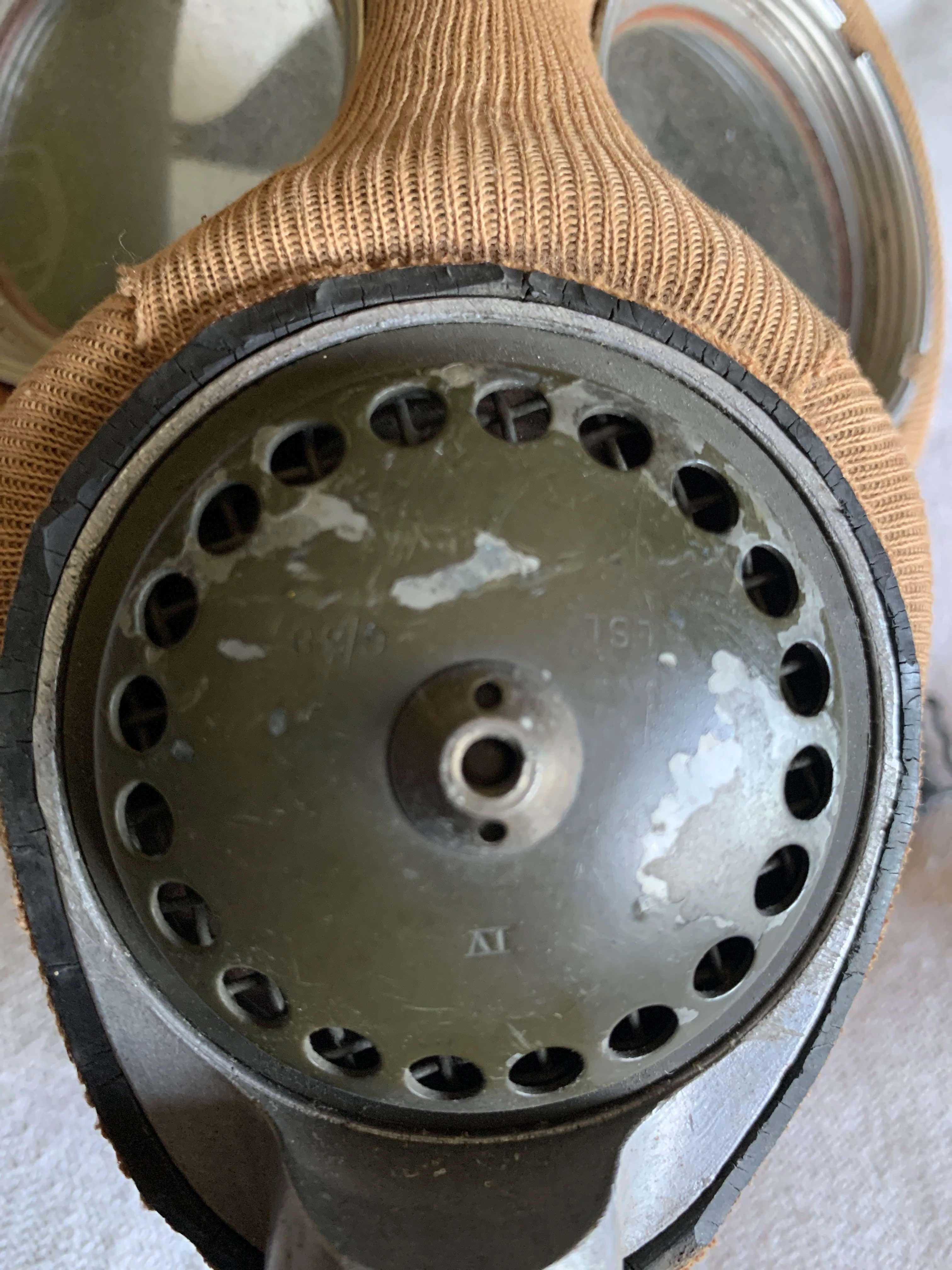 The original British rubber hose was removed, and a metal connector piece—apparently of Czech manufacture—was welded directly to the front metal intake assembly of the Mk IV mask. This modification allowed for the direct attachment of standard French filters, bypassing the need for the original hose and filter combination. It's unclear if this modification was done during the Second World War or afterwards.