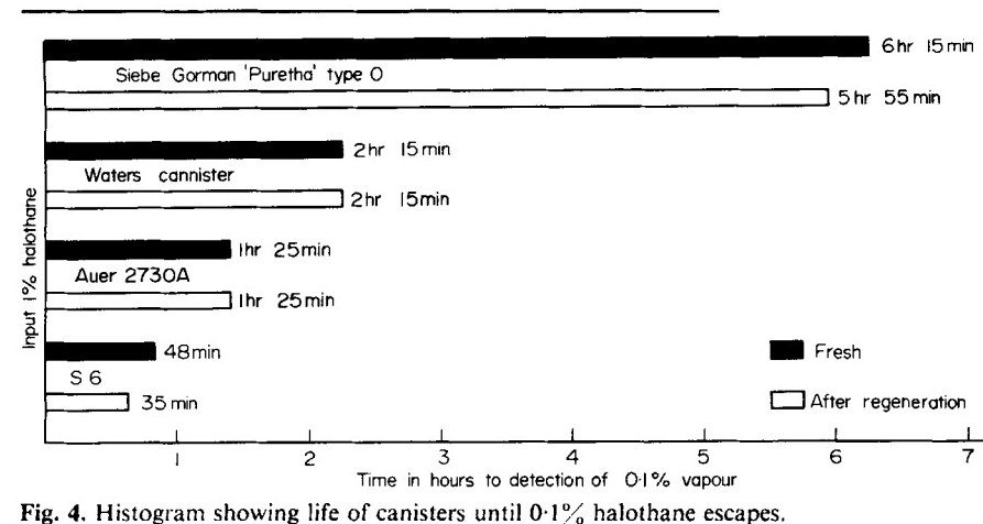 However, a non-military study was published by Hawkins in 1973. This study examined the usage of 4 different canisters against 3 different anaesthetic gases. The 4 canisters in question were: 'Siebe-Gorman Puretha Type 'O', 'The Waters Canister', 'Auer 2703A' and 'The military S6 canister'.
