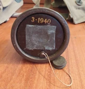 These layers were pressed by metal diaphragms, with the bottom creating a small gap between the inlet and the filtering mass so that the air could spread and ease breathing resistance. Before being opened, the bottom intake is covered by a small sheet of waxed canvas and the top is closed using a 40 mm cap, with all of this bound with a string closed using a small lead seal. After the filter has been opened for the first time, it could be closed again using the 40mm cap and a small rubber seal attached through a string to the filter. The height and weight of the filter vary with the date of production and manufacturer.